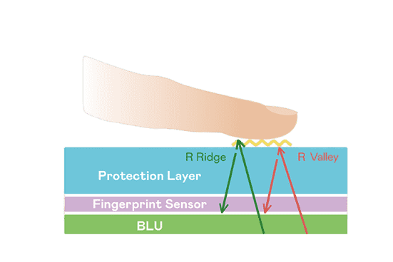 TFT 指纹扫描感测技术利用薄膜电晶体 (TFT) 当作光感测元件,,,,藉由非晶硅 (a-Si) 与低温多晶硅(LTPS)既有光电转换特性对不同波段光源进行吸收,,,,使感测 IC 读取阵列感测元件的光漏电差异,,,,转换成数位灰阶影像。。。